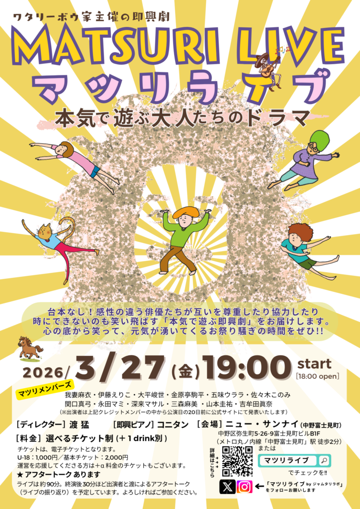 即興劇「マツリライブ」は2026年3月27日(金)19:00開演!中野富士見町駅徒歩2分の「ニュー・サンナイ」にて開催します!!