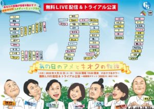即興ミュージカル「ヒカリ~あの日のアメとキオクの物語~配信トライアル公演」を緊急実施!!客席やインターネットコメントから事前に単語や台詞を募集し、舞台上に配置。演者同士の打ち合わせや事前開示無しで劇本番中に演者がランダムに引き、即興で台詞や曲にしてストーリーを繋ぐ観客参加型の即興ミュージカル劇。